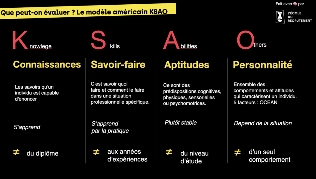 On revient aux principes de la critérologie : choisir un critère clair et directement lié au poste. Pour y arriver on a une cartographie qui fonctionne mieux que savoir-faire/savoir-être, cette cartographie c’est les KSAO.